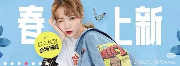 這種點綴比較簡單,就是把產(chǎn)品的賣點提煉出來,使用背景的對比色或者鄰近色將賣點整個突顯出來,此類點綴多使用在年輕女性為主導用戶的產(chǎn)品 Banner 中,比如衣服,首飾、護膚品等,難度系數(shù)不大,難點在于對色彩及賣點提煉的把控。