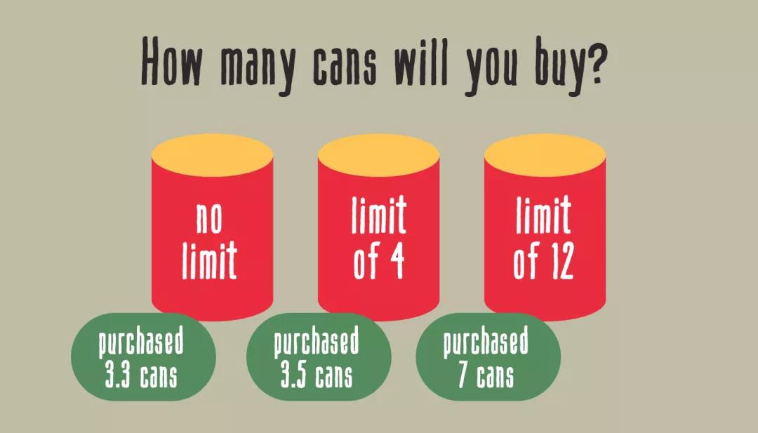 在這個測試當中,實驗人員會記錄用戶購買罐裝的湯,通常而言用戶會一次購買2到3罐,可是當實驗人員開始限制用戶的購買數量之后,用戶購買湯的數量則增加到了5到10灌上海藝覺,購買數量翻了2到3倍。